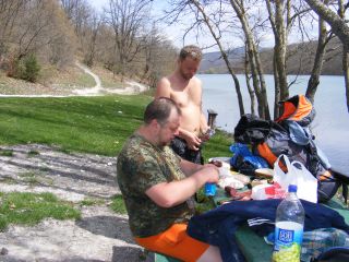 Так мы бы еще шлепали бы часа три до озера и возможно там бы и остались ночевать. А так пришлось купаться, обедать. Андрюша — резать бутерброды.