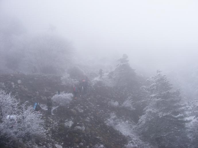 По тропе, вдоль склона. Тропа сказочная. Жаль погодные условия не позволяют оценить ее красоту. Но даже и того что было видно доставило огромное удовольствие — узкая тропа вдоль склона.