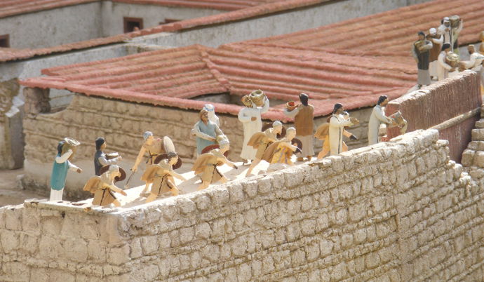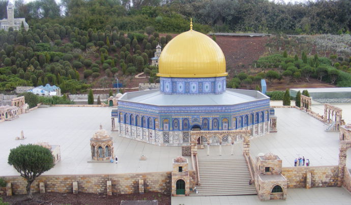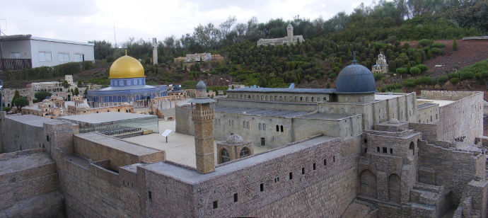 Все маленькие деревья — натуральные. Трава — настоящая, кустики — настоящие. Фигурки людей, кое-где двигаются. На военном плацу проходят марши "солдатиков". У стены плача — фигурки качаются. По дорогам ездят машинки, по рекам — ходят кораблики.