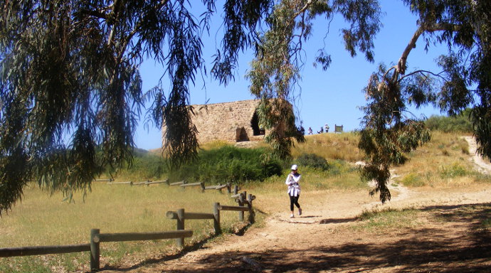 Пройдя километра полтора, добираемся до Хирбет Смара, внушительного каменного сооружения на вершине холма, откуда открывается захватывающий вид на окрестности. Фортификация была возведена в конце XIX века Абдаллой Смара, владельцем окрестных земель, в качестве сторожевого пункта. Несколько позднее, в период коммерческого расцвета экспорта арбузов в Египет с пристани «абу-Збура» на Хоф (берег) Михморет, оттоманские власти отвели сооружение Смара под таможню и полицейский участок.