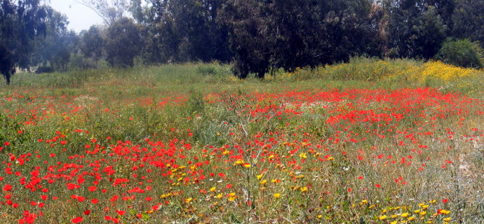 На заднем пути решено пройти через эвкалиптовый лес, где на краю леса — маковое поле
