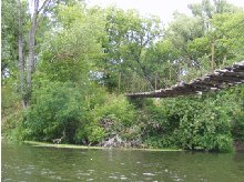Первое препятствие. Мост. Мы попытались его пройти, притопив байду — решили не мучиться, пожалели скотинку — мы его обнесли. Там того обносу 10 метров, а мост весь гвоздями утыкан, Рисковать? Увольте.