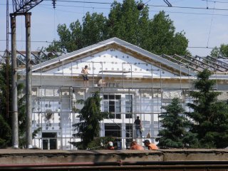 Приехали на электричке. Еще в электричке нас машинист предупредил — выход на платформу из 1-х трех вагонов. Мне это не грозило — ехал в первом, но заинтересовало. Ремонт платформы. Ремонт вокзала. Платформа действительно требовала ремонта, да и вокзал не мешало бы обновить, но обновляют его по-взрослому. Смена крыши, фасад.