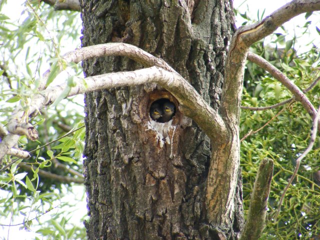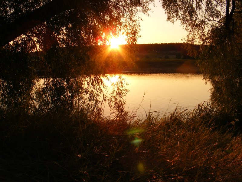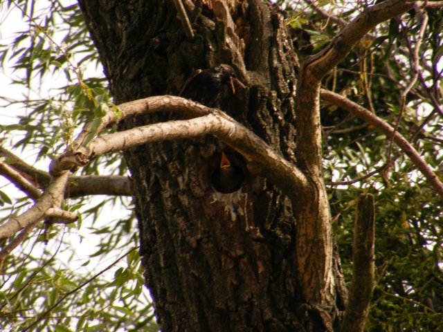 Стали на ночевку. До ночевки еще ого сколько. Но место безлюдное. Только парочка на велах приехала рыбку половить, но они уже собираются. Заняли место. Вовремя. Народ на машинах подъезжает и разворачивается — место занято. Хорошо! Тишина. Только крик скворцов. И началась охота. Я принял удобную позу. Ксения на досмотре. Скворец на подлете издает крик. Ксюха кричит — давай снимай. Детеныши тоже начинают кричать. Я даже кино снял "Кормежка скворцов". Если кому интересно, пролежал минут тридцать. Среднее время подлета кормильца около 2-х минут. Сначала скворцы летали налево. К вечеру полетели направо.