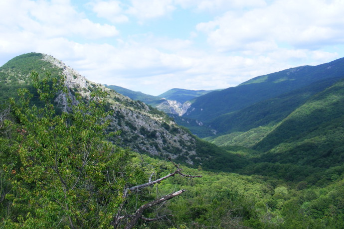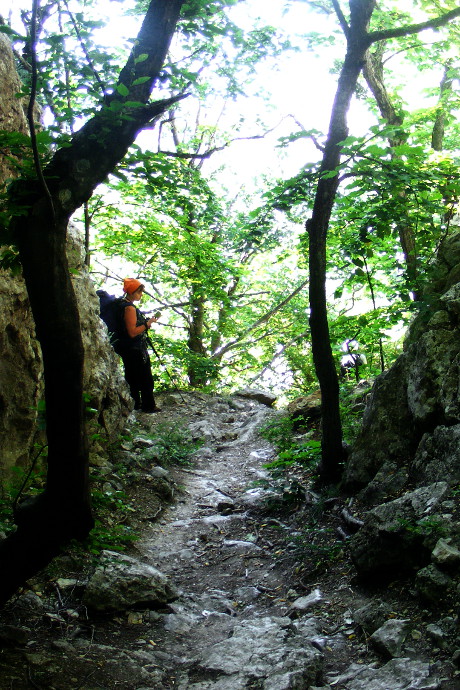 Спуск с 950 метров, до уровня моря. От ночевки на источнике возле Балчик-кая начался спуск без подъемов и выполаживаний до самой(го) Шайтан-мердвеня. Дорога может быть идет по более легкому пути, но мы легких путей не ищем, а по хорошей тропе идем вниз. До… Бац… речушка, и якобы спуск. Якобы. Почему-то при виде такого спуска ноги отказываются идти (шютка). Первое — абсолютно ничего не видно вниз. Второе — абсолютно нет видимых попыток хождения людей. Третье — абсолютно нет никакого специализированного снаряжения для прохождения таких маршрутов, а вдруг там "засада".