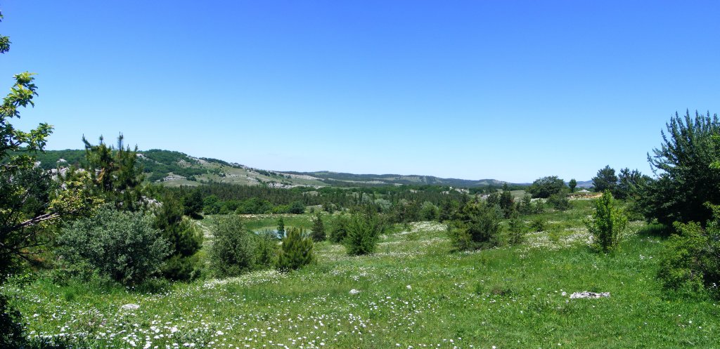 Двигаемся по яйле в сторону Беш-кетне. Где-то в этом месте начнем "резать". Срежем чуть-чуть, но в этом месте можно увидеть кусок трубы в земле магистрального водопровода.