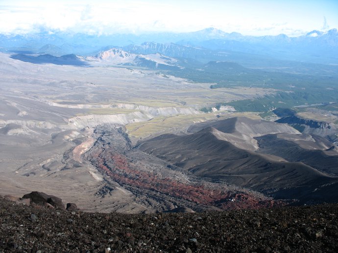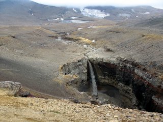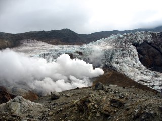 Это конечно, потрясающий вид. Ледник и пар из земли. А также то ли река такую дыру пробила, то ли это след лавового потока.