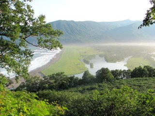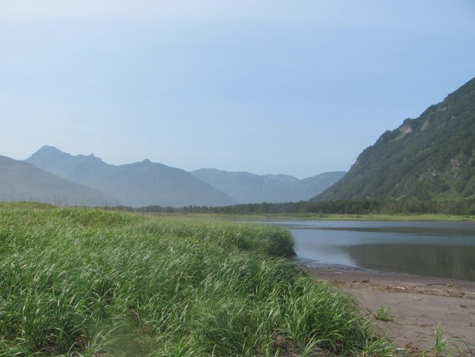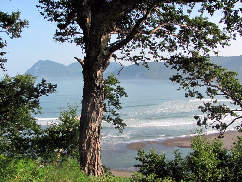 Дальше было много интересного, но — или повторение увиденного, или что-то где-то смазалось. Но вот такого вида на Тихий Океан еще не было. Тю… Что я говорю. Океан не Тихий, он за спиной, а это устье реки, которая впадает в Тихий океан. Название реки не скажу, не запомнил. Пусть хоть один участник, увидев такую несправедливость, скажет.