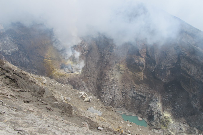 Но ведь так хочется заглянуть вовнутрь. Место откуда исходит сероводород — то ли кратер, то ли чисто фумарольное жерло. Но рядом — кислое озеро