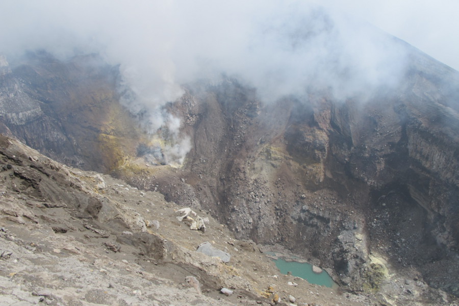 Взошли. Ничего практически не видно, но порывами ветра очищается и очищается просмотр. Проявляется озеро. Вулканологи утверждают, что озеро пресное.