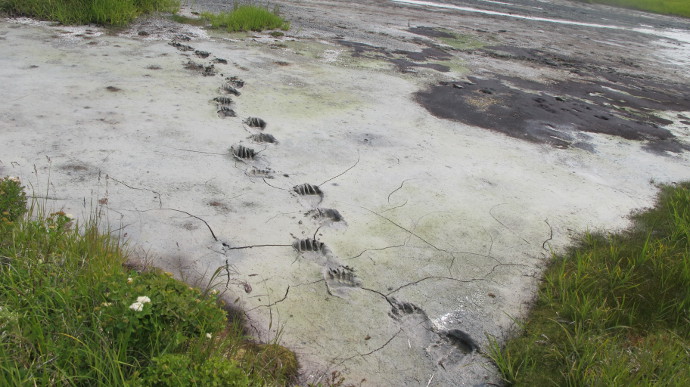 Можно только удивляться и, наверное, восхищаться медведями, как они пересекают термальные площадки.