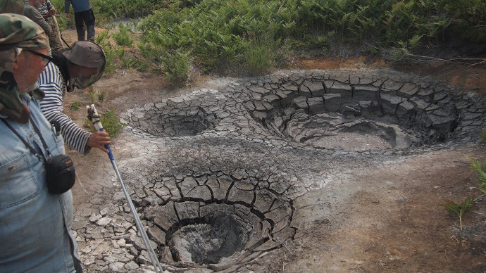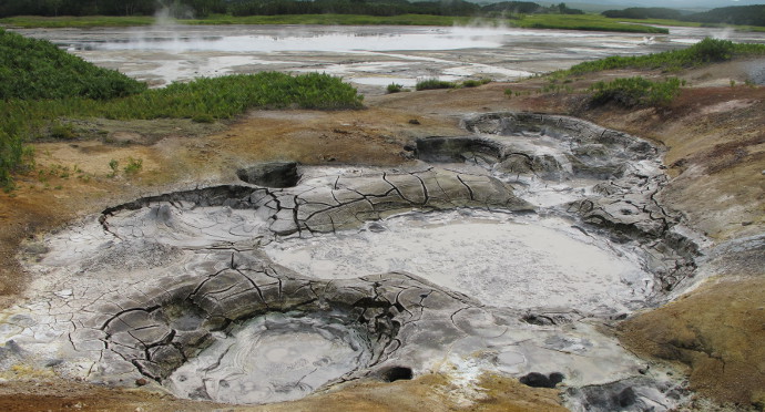 Грязевые вулканчики действуют почти как настоящие: шипение и ленивое бульканье — из-под зыбких корок брызжет, вылетает глина и клокочет кипяток.