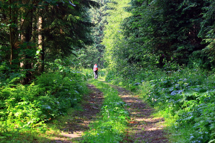 Спустились вниз… Тропа шикарнейшая, по хребту, по лесу, только, увы, гор не видно. Но как лес — великолепен.