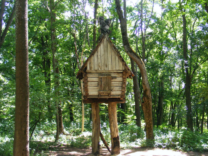 Избушка там на курьих ножках стоит… Ну, ножки совсем не курьи, и окна и двери есть. И филин, наверное, за спиной у Бабы Яги.
