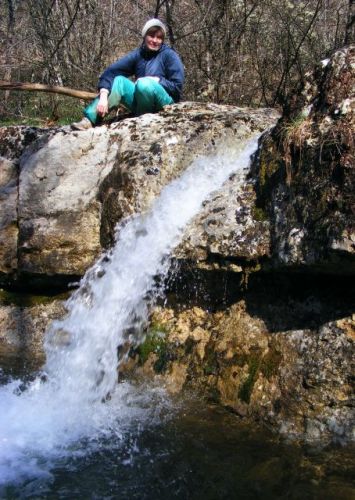 Наша барышня над водопадиком. Сидит, наблюдает, как мы принимаем ванну.