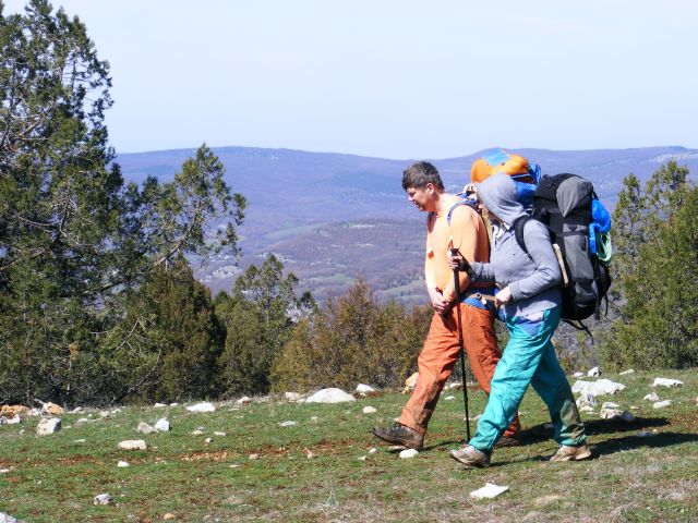 Там ночевка планируется. Спуск. Лес красивый. Перевалили через хребет, снег исчез, даже нет и намека.
