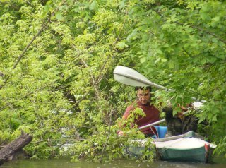 Слева и справа не обходится. Берег не для обноса. Но вода высокая, перекатывается через упавшее дерево. Преволачиваем байды. И продолжаем маршрут. Река сузилась, течение достаточно сильное. Река красивущщая. Все в ранней зелени.