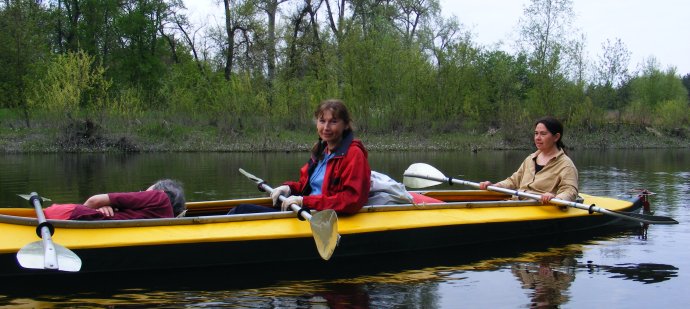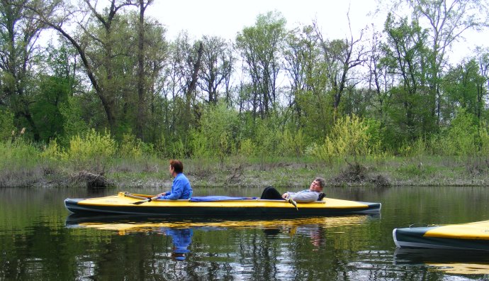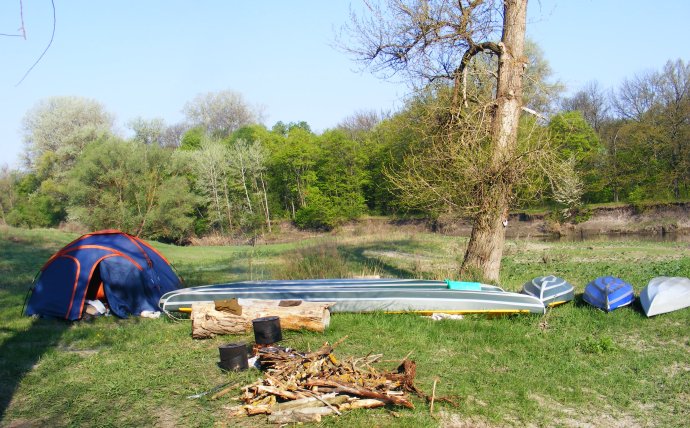 Вот-вот сейчас за поворотом станем на ночевку. Там песчаный берег. В прошлом году, в апреле мы там встретили семейство кабанов. На этот раз — место уже занято, увы. Не кабанами — такими же любителями майско-водного отдыха. Река большая — место найдем.