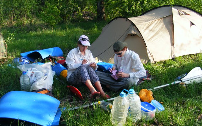 А в это время (двое гребут)… Лагерь, дрова, ужин, гитара. Каждые полчаса звонок ушедшим — где, как?