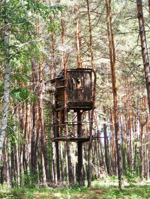 Дорога до Тимченков проходит вдоль однопутки, лесом, ничего особенного из себя не представляя, разве что подарив нам вот такой дом на деревьях.