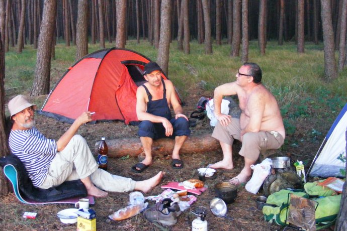 Утро, по "холодку", если 8 часов утра можно назвать "холодком" и утром, дошли до какого-то села, присели возле магазина. Ой как на порадовала эта замечательная парочка. Ну, мы как положено, кино смотрели с пивом.