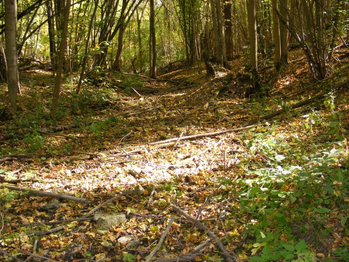 От Пятницкого до Печенежского водохранилища прямая дорога. И вдруг резко вправо-влево. А прямо… Ух… 2 минуты позора — спуск на пятой точке по склону (листья+сухая земля) и уже на берегу. Где и заночуем.