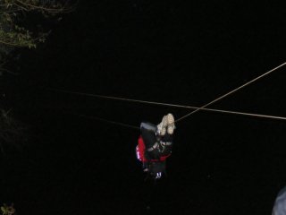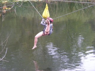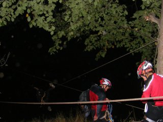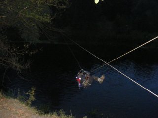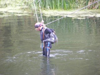 Распутываем 200 метров веревки. Серега влазит в систему, переправляется на другую сторону. привязывает концы. И обратно.