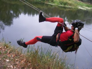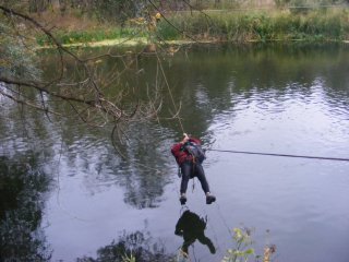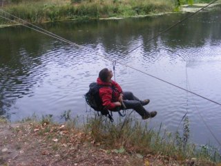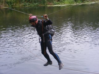 Получилось. Ребята натянули переправу. Попытались ее пройти, И… Надо тянуть. Два мужика качественную переправу при всем большом желании не натянут, а тем более — 35 метров.