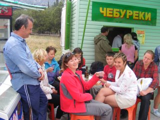 Кстати о чебуреках и вине. Обмывши Юрчика в море, провожаем его домой. Ну как же без сухого вина? И по чебуреку, а то и по два, и три. Чебуреки готовят на глазах. Раскатывается тесто, начинка, жарятся. О вкусах не спорят, как по мне — съедобно.
