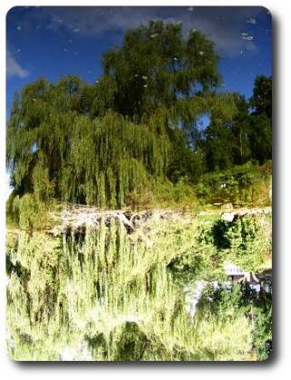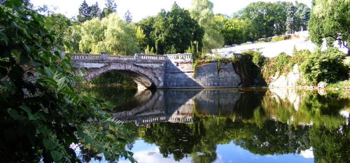 Перейти через мостик, спуститься к воде и показать всем арочный мостик.