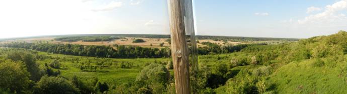Уже много лет замечал на склоне за меловой вот эту пожарную вышку. Летом там еще и пожарная машина стоит. Но все не было времени туда сходить. Теперь же — пошел. Ниже — результат. Обалденная панорама русла Донца, лес. Вот только столб мешает.