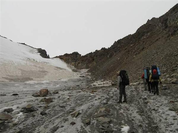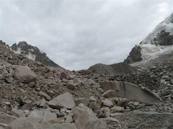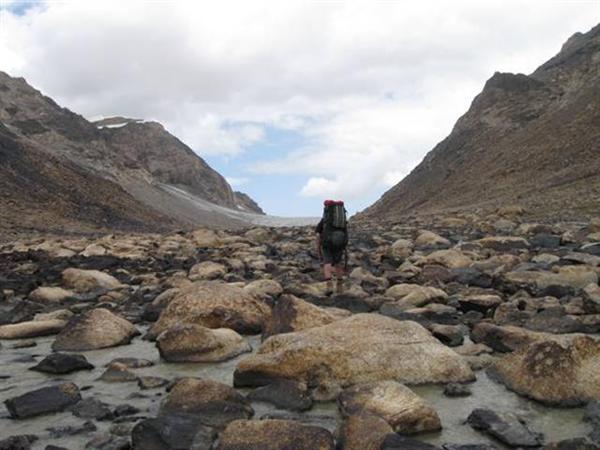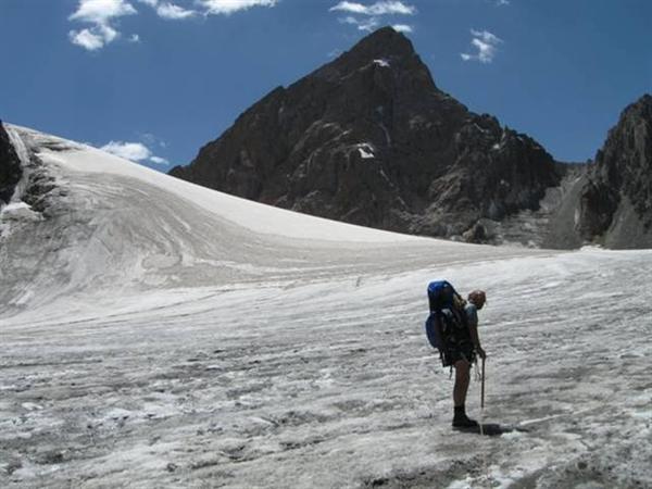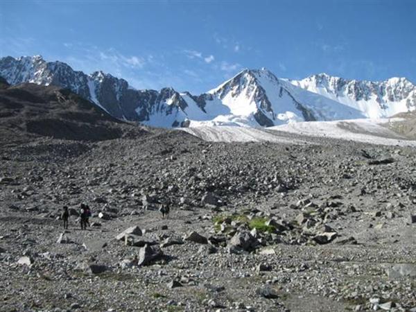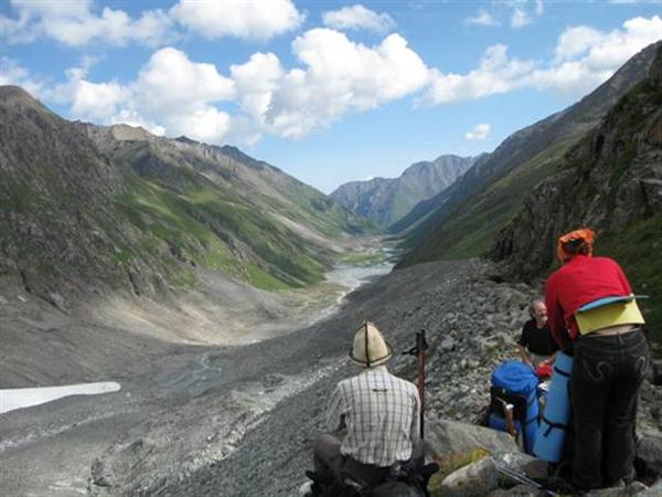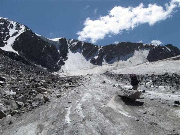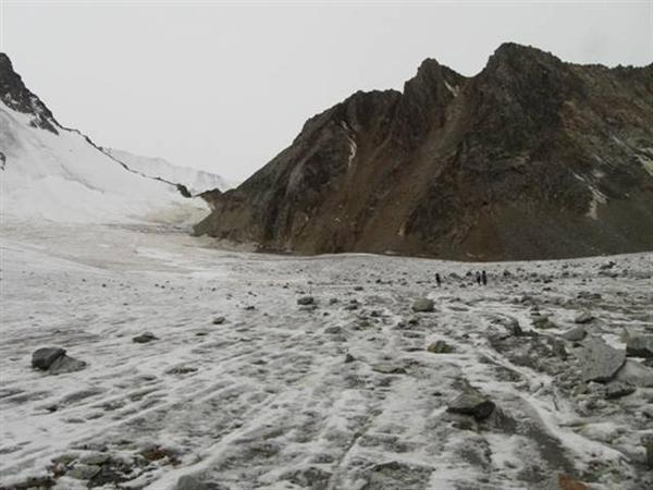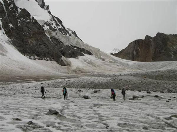 Ледник Джигит в наших условиях в верхней части был открытый (Фото 19). Для спуска в долину нужно идти по правому краю, обходя трещины. За полчаса можно спуститься на нижнюю часть ледника, где, перейдя моренный шлейф, попадаешь на его срединную часть. Подойдя к крутому языку, уходить с него лучше на правобережную морену. Путь по морене выводит на слабовыраженную тропу по правому берегу реки, которая приводит к слиянию рек с ледников Бригантина и Джигит. Время спуска от подножия перевала до языка ледника — 1, 5 часа, ещё полчаса до слияния рек.