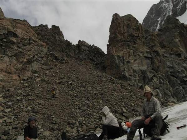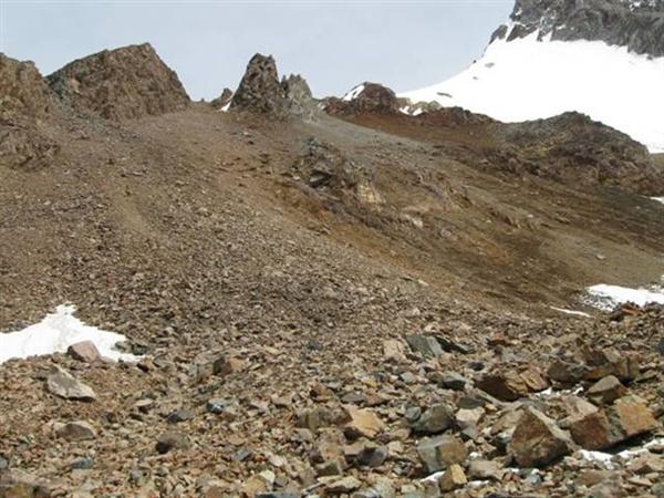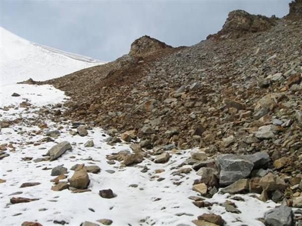 Спуск на запад — осыпной склон крутизной 30–35° и протяженностью до 300 метров (Фото 18). Осыпь средняя, сильно подвижна. Очень камнеопасно. Камни едут не только под ногами, но и тянут за собой соседние, площадью до 3 кв.м. Спуск очень неприятен. Направление движения — прямо вниз с дальнейшим забором вправо. В нижней части камни становятся крупными. Спуск до пологого ледника занял минут 50, так как приходилось двигаться поочерёдно и ждать ухода предыдущего спускающегося вправо от линии падения камней.