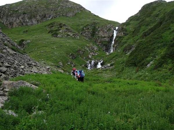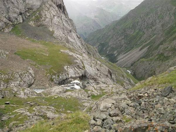 На север спуск начинается по пологому леднику, однако крутизна быстро возрастает. Следует одеть кошки и двигаться в правой части склона вдоль скально-осыпных выходов. Движение по морене и скалкам более затруднительно, т.к. прерывается участками крутого льда. В нижней части ледник обрывается крутым лбом, и приходится выйти на правобережный моренный вал. Движение по морене крайне неудобно, трудно представить, как тут проходит скот (Фото 37). Пройдя метров 200 дальше языка ледника, выходим на слабовыраженную тропу, выбирающую себе путь в камнях. По ней сбрасываем высоту до почти ровных травянистых площадок (Фото 38). В этом месте справа в основное русло круто по камням впадает река. Спуск с перевала сюда занял почти 2 часа. Ниже травянистых площадок р. Джукучак обрывается красивым водопадом. Тропы есть по обоим берегам, но, чтобы избежать брода на левый берег в низовьях реки, приходится перепрыгивать по камням р. Джукучак выше впадения в неё реки справа. От площадок тропа круто сбрасывает высоту, обходя водопад, и попадает на травянисто-осыпные склоны (Фото 39). Вскоре появляются первые пасущиеся коровы и лошади. Через час долина сильно расширяется, на обоих берегах расположены коши и пасутся стада коров. Тропа пересекает разливы реки и заболоченные участки. Долина очень широкая и практически горизонтальная, лес растёт далеко на склонах (Фото 40). Через 3, 5–4 часа от водопада долина превращается в ущелье, и скотогонная тропа в лесу, местами выполаживаясь, сбрасывает высоту до реки Джукучак, превращаясь в дорогую. Здесь, на месте старого моста, возможен только конный брод на правый берег. Однако ниже по реке в 500 метрах есть мост, попасть на который можно по тропе высоко на склоне ущелья. По правому берегу реки идёт уже хорошо езженная дорога, приводящая через 2 километра на курорт с горячими ваннами. Заезд сюда от селения Сару возможен даже на легковой машине. Спуск с перевала Джукучак до курорта занимает 8 часов