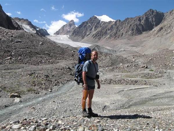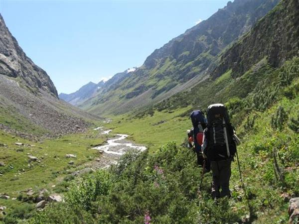 Спуск с перевала до пологой части ледника Он-тор представляет собой 100-метровый осыпной кулуар крутизной 30–35° и занимает15 минут (Фото 24). Ледник открытый, неширокие трещины легко обходятся. Движемся сначала по правому борту, затем выходим на серединную морену, а ближе к языку уходим влево на основное русло чистого от камней ледника. В нижней части сходим со льда на левобережную морену и вскоре попадаем на тропу вдоль реки Он-тор (Фото 26).