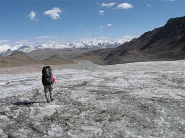 Горизонтальный участок долины заканчивается старой мореной, по которой река течёт с ледника. Крутизна в 20° скоро падает, и мы попадаем в верхнюю часть ущелья, где идём прямо по камням, через которые течёт разлившаяся река (Фото 36). Подходим к озеру, лежащему у языка ледника, и обходим его слева по крупной морене и завалу. При выходе на лёд крутизна до 25°, двигаемся без кошек по вмёрзшим в лёд камням. Ледник постепенно выполаживается, и, попадая на ледовое плато, понимаешь, что это уже перевал. Тура нет, т.к. осыпные склоны довольно далеко. Время обхода травянистых отрогов от рек Ашу-тор Южн. и Кызыл-су до седловинки в хребте — 2, 5 перехода, ещё столько же требуется для выхода на перевал.