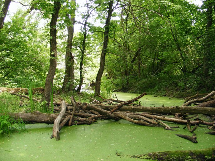 Такая фотка у меня есть, но тогда воды было поменьше. А здесь видно, что если убрать бревна, то можно и в озеро (на дальнем плане) зайти.