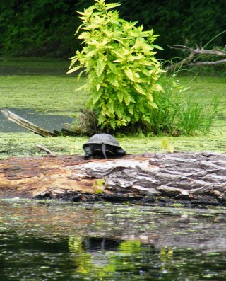 Попытался сфотогафировать черепаху. Наивный! Ну, да! Весной это "скотины" даже не шевельнутся если к ним близко пдойдешь. Летом они как пули слетают с насиженных бревен. А эта "скотина" еще и повернулась ко мне своим задом.