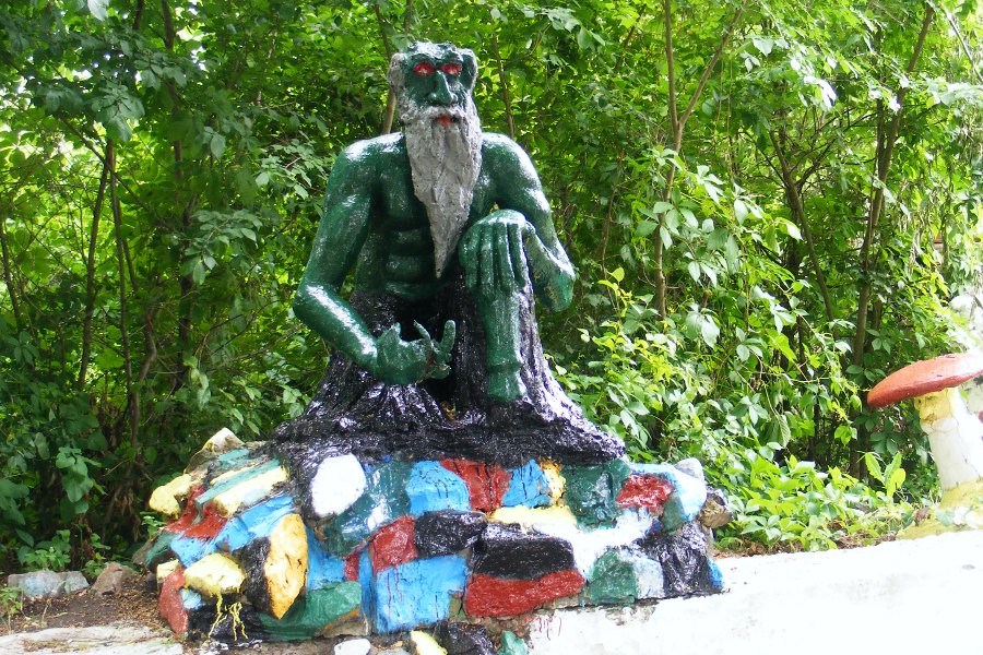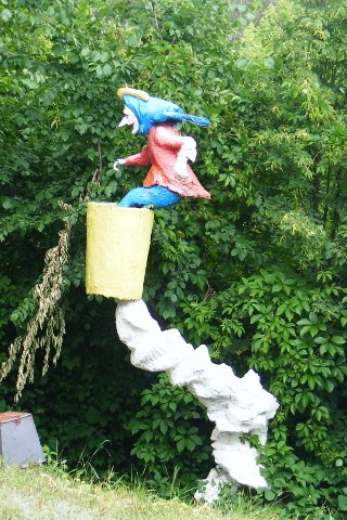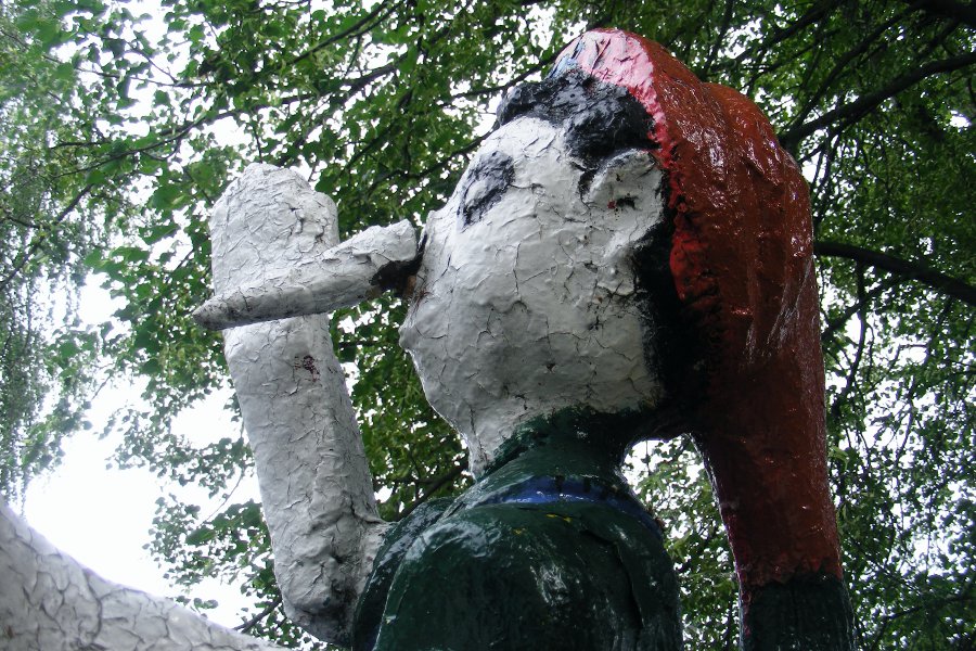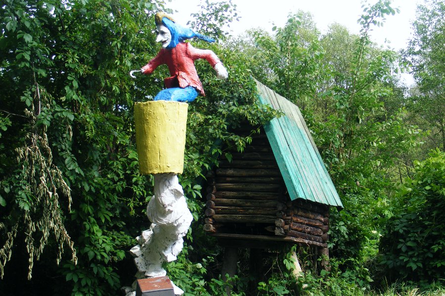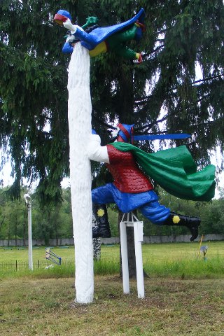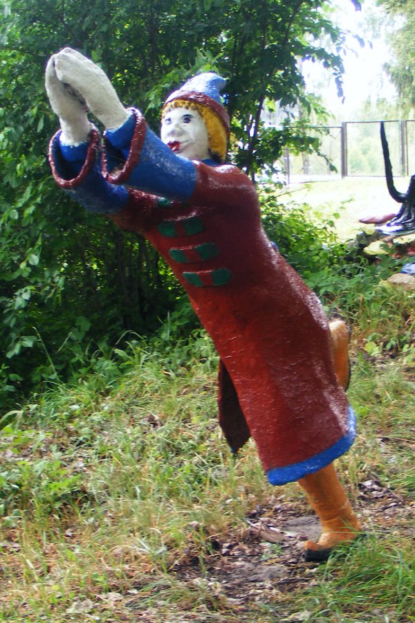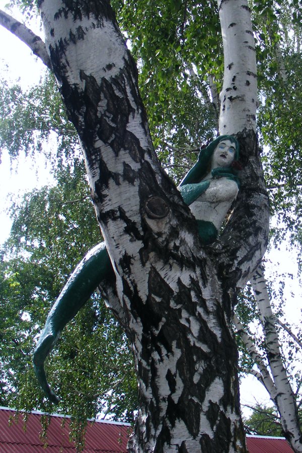 Герой русских сказок. Иван-дурак. Только дурак мог застыть в такой позе. А вот русалка на ветвях сидит.