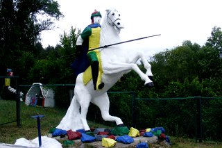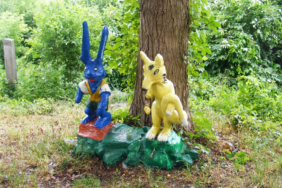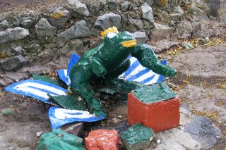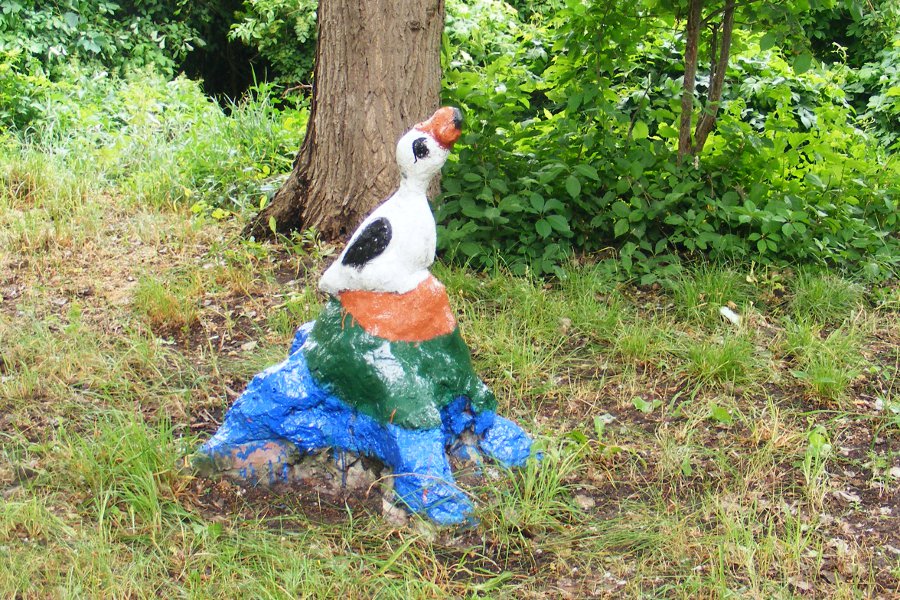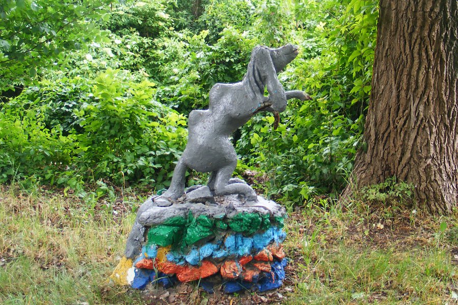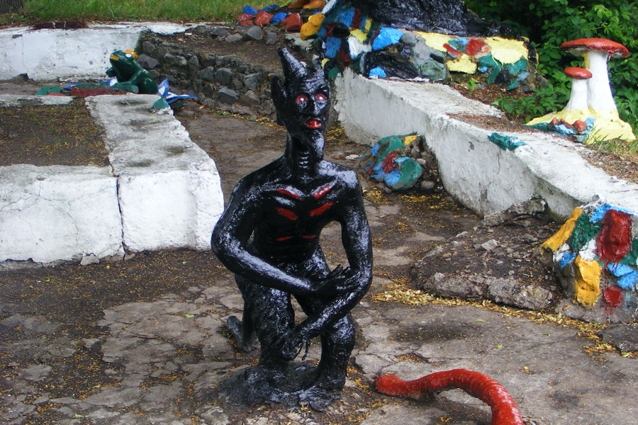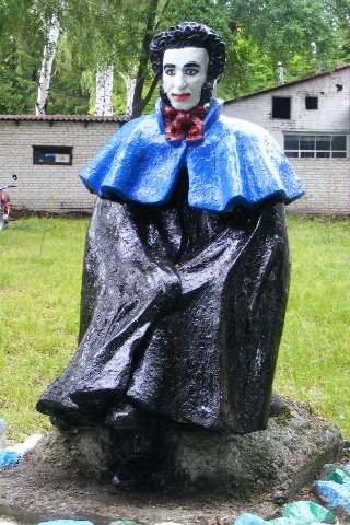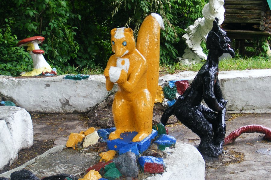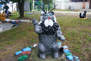 Герой русских сказок. Иван-дурак. Только дурак мог застыть в такой позе. А вот русалка на ветвях сидит.