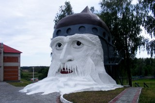 "Подъехав ближе, при свете луны Руслан видит живую голову в богатырском шлеме с перьями, которые содрогаются от её храпа.